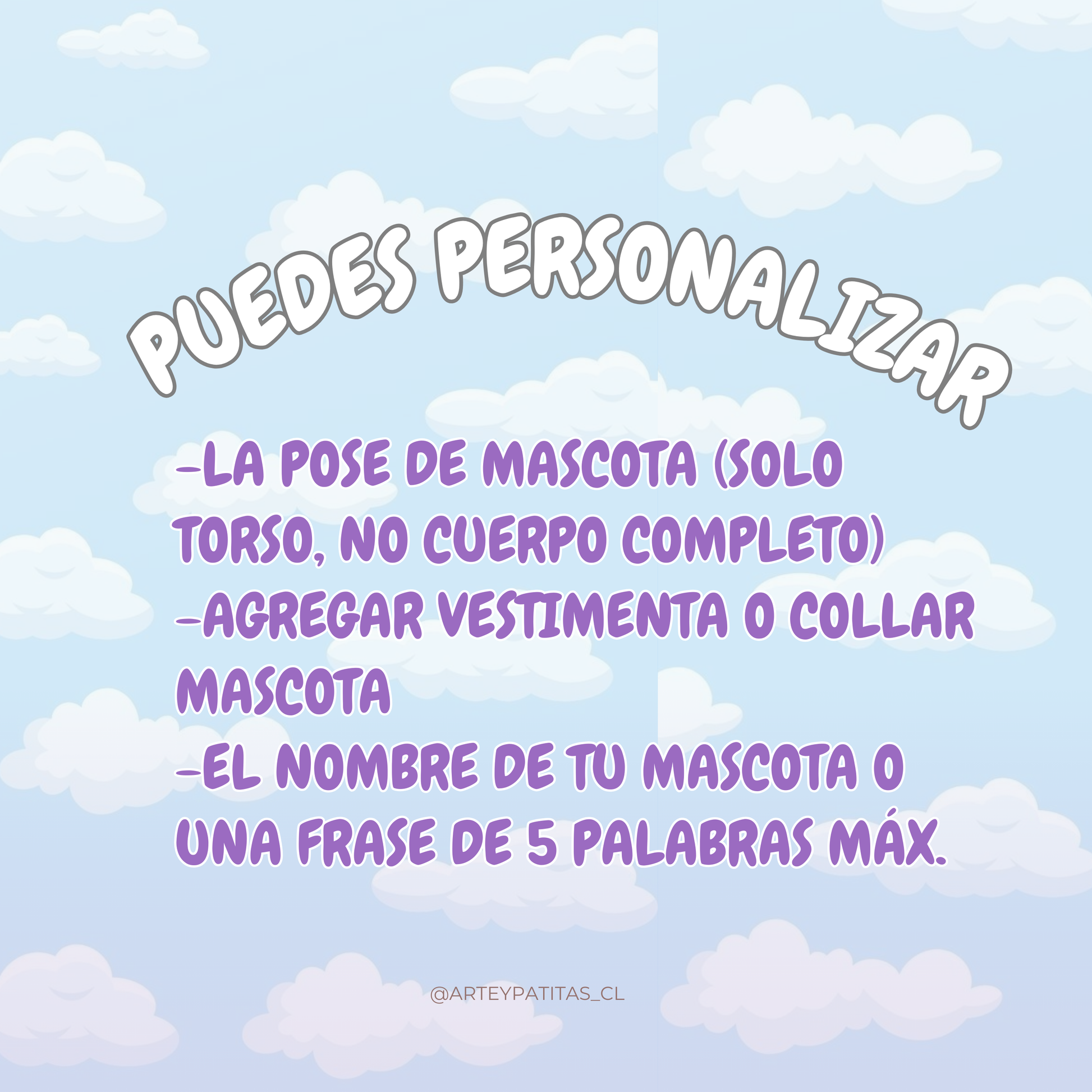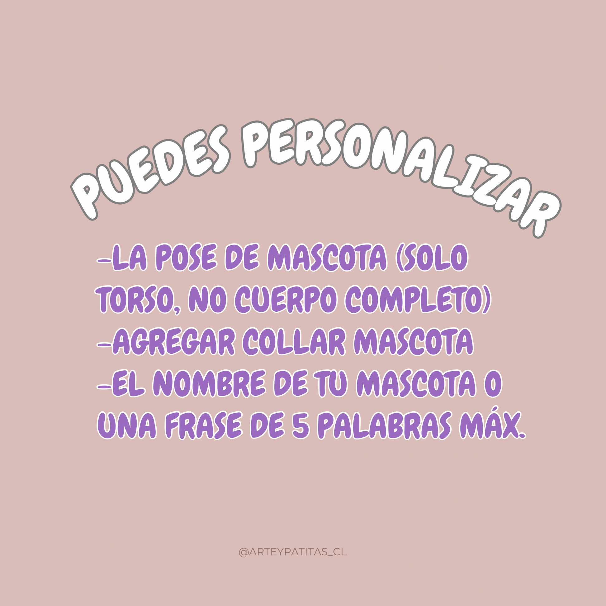 - Envíanos nombre, foto y detalles por mensaje por instagram @arteypatitas_cl