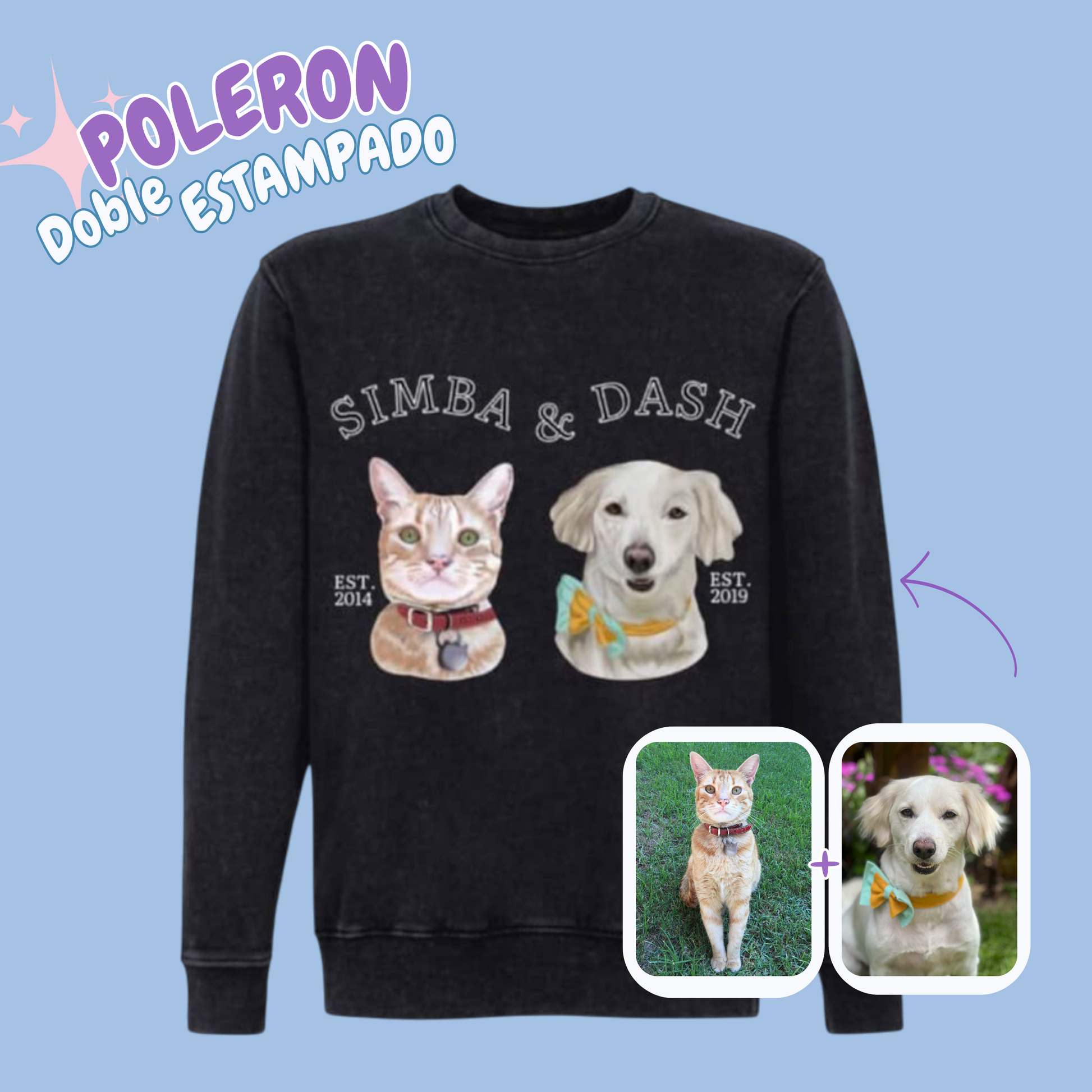 ¡Lleva a tu mejor amigo siempre contigo! Con nuestra Poleron personalizado, lucirás un retrato de tus mascotas estampado, esta ilustración es elaborada a mano en formato digital